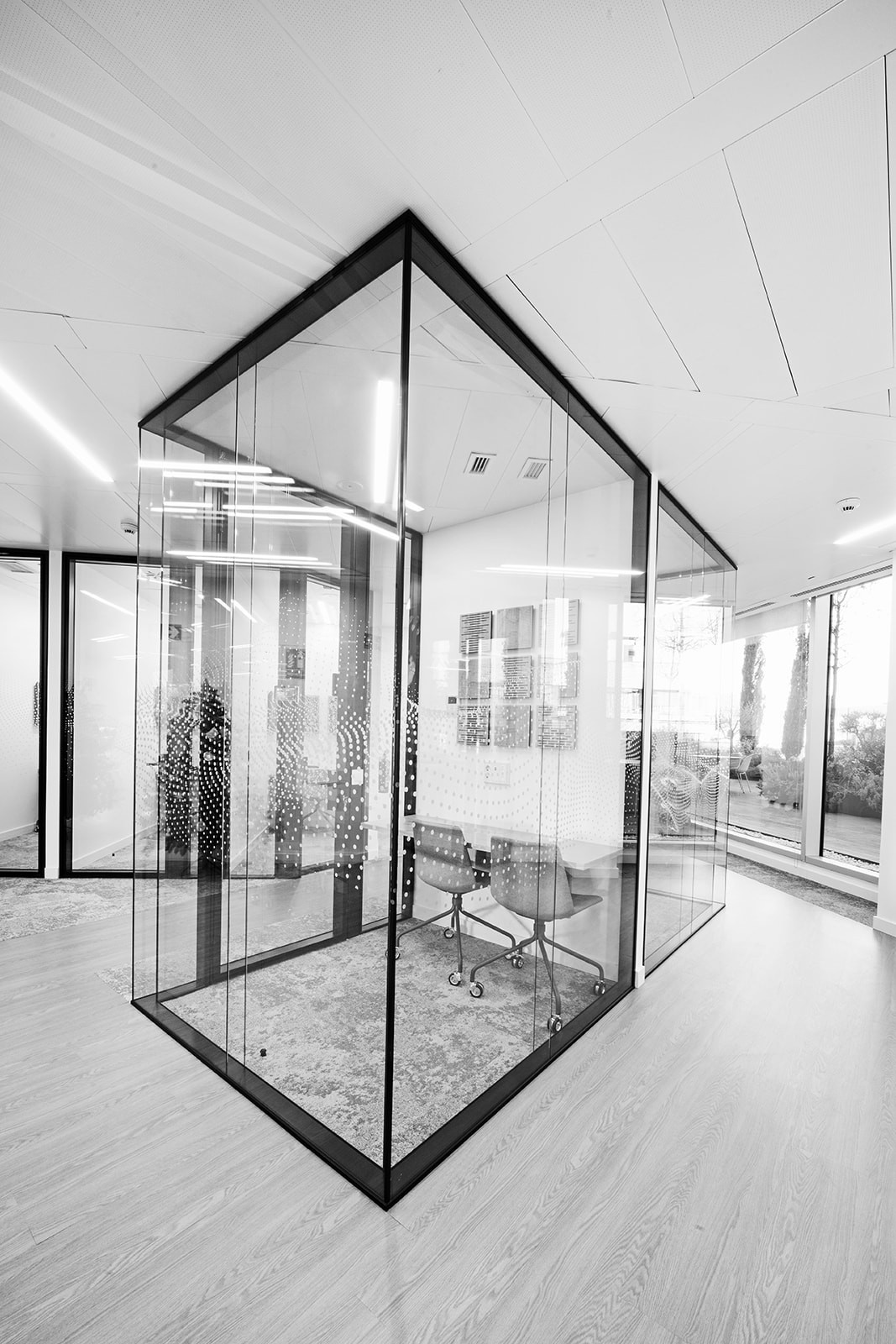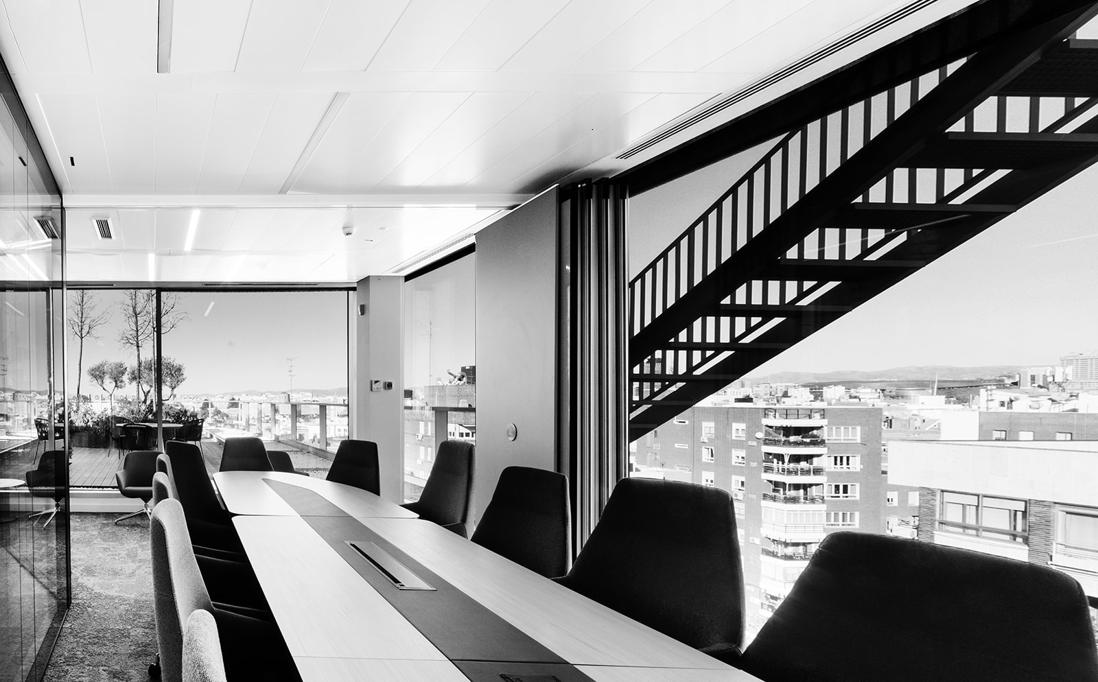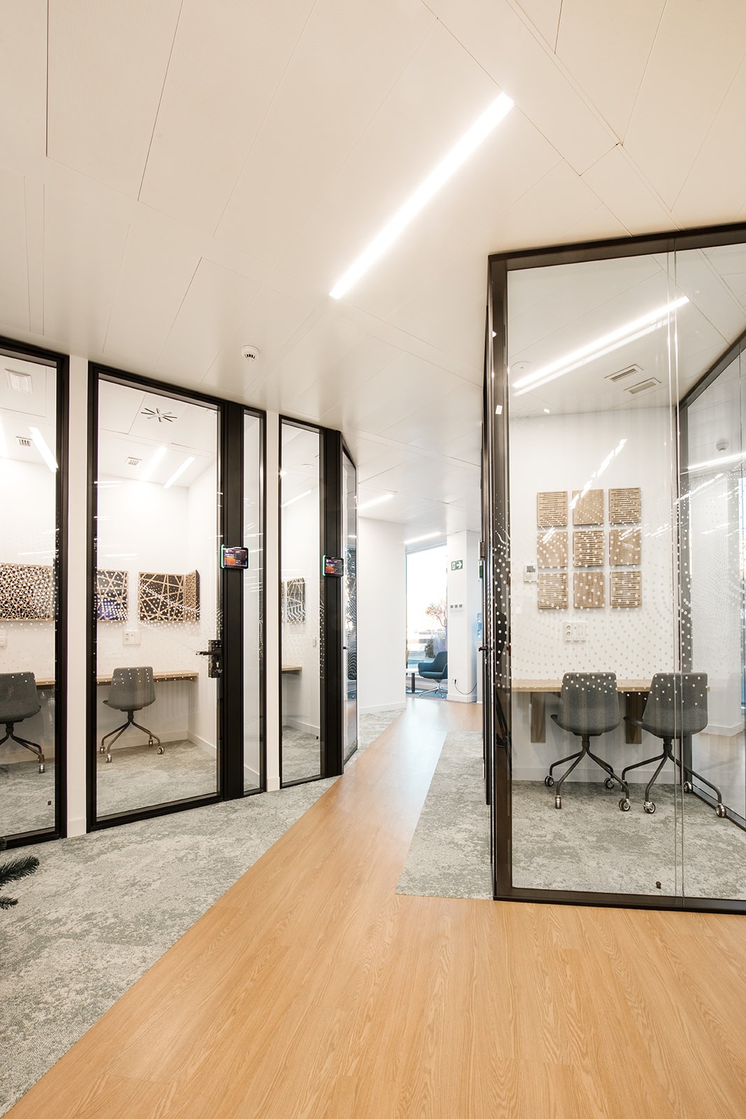 La propuesta se apoyó en una distribución eficiente y muy luminosa, con salas de reunión de carácter institucional, cerramientos acristalados que aportan transparencia y control acústico, y áreas comunes pensadas para el equipo como comedor y zonas polivalentes con mobiliario funcional. A nivel de ejecución, cuidamos la coherencia entre acabados, carpinterías y soluciones técnicas para mantener un lenguaje sobrio y contemporáneo en todo el conjunto. El resultado es una oficina preparada para operar desde el primer día, entregada en 17 semanas con coordinación total entre diseño, licencias y obra.