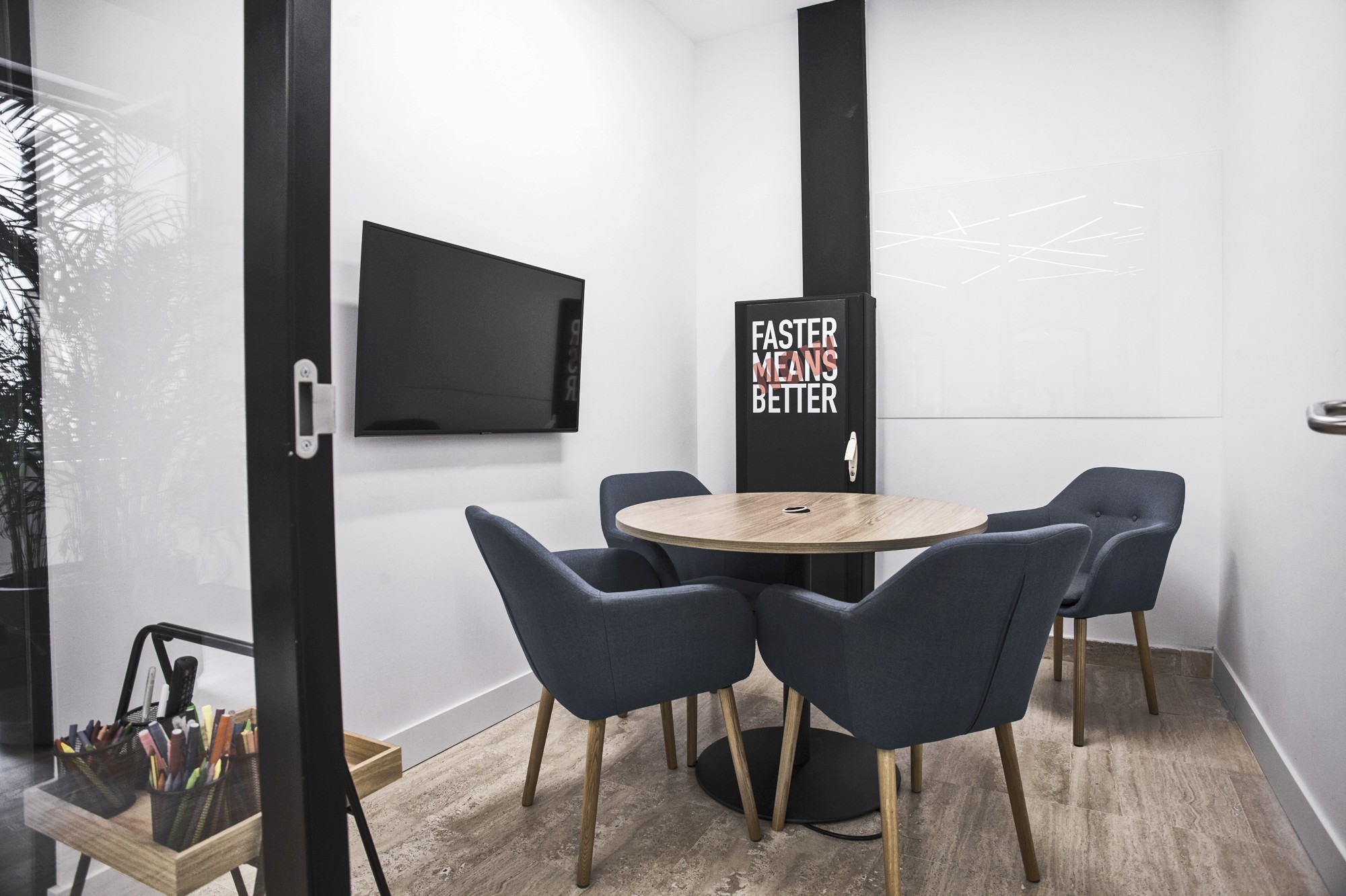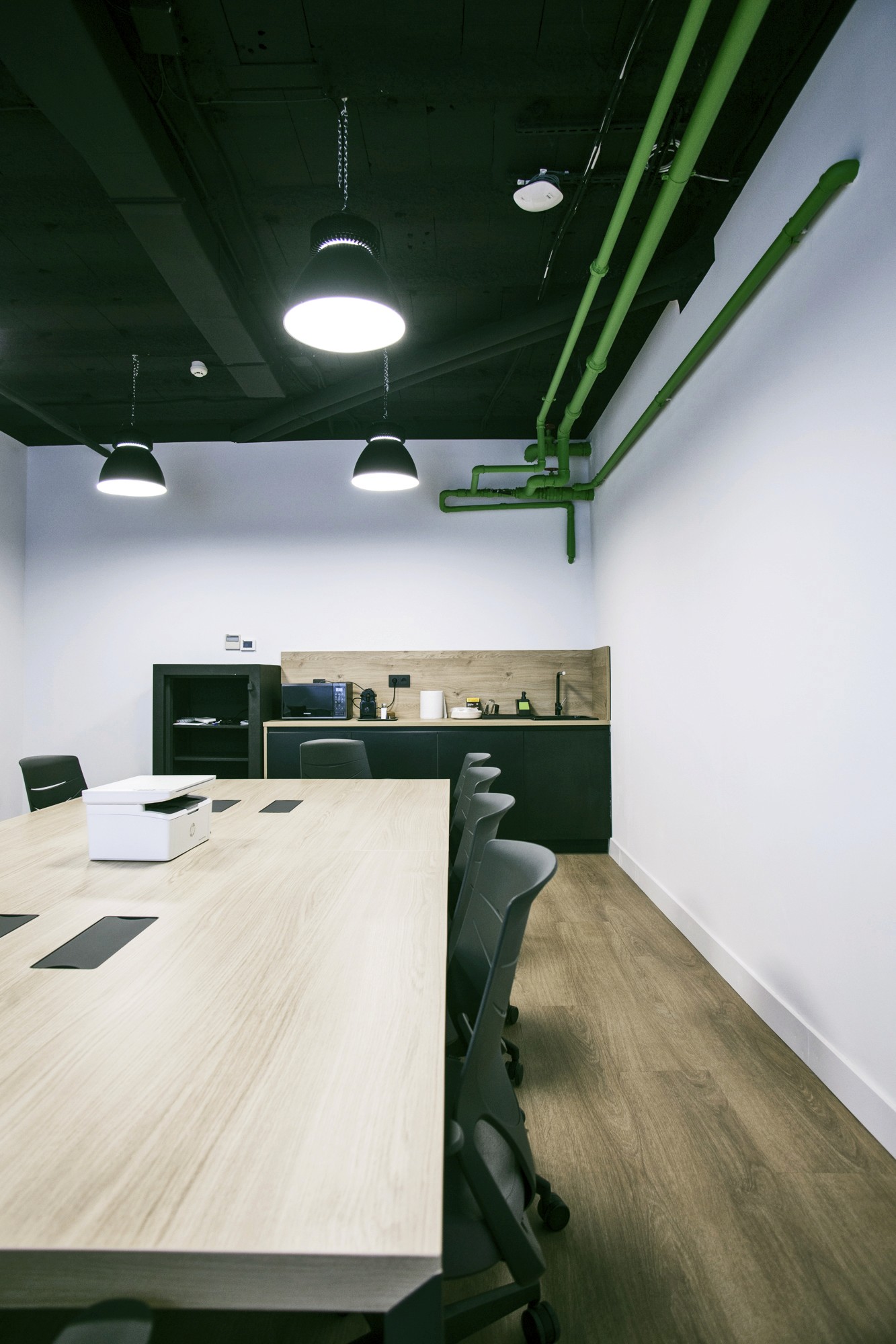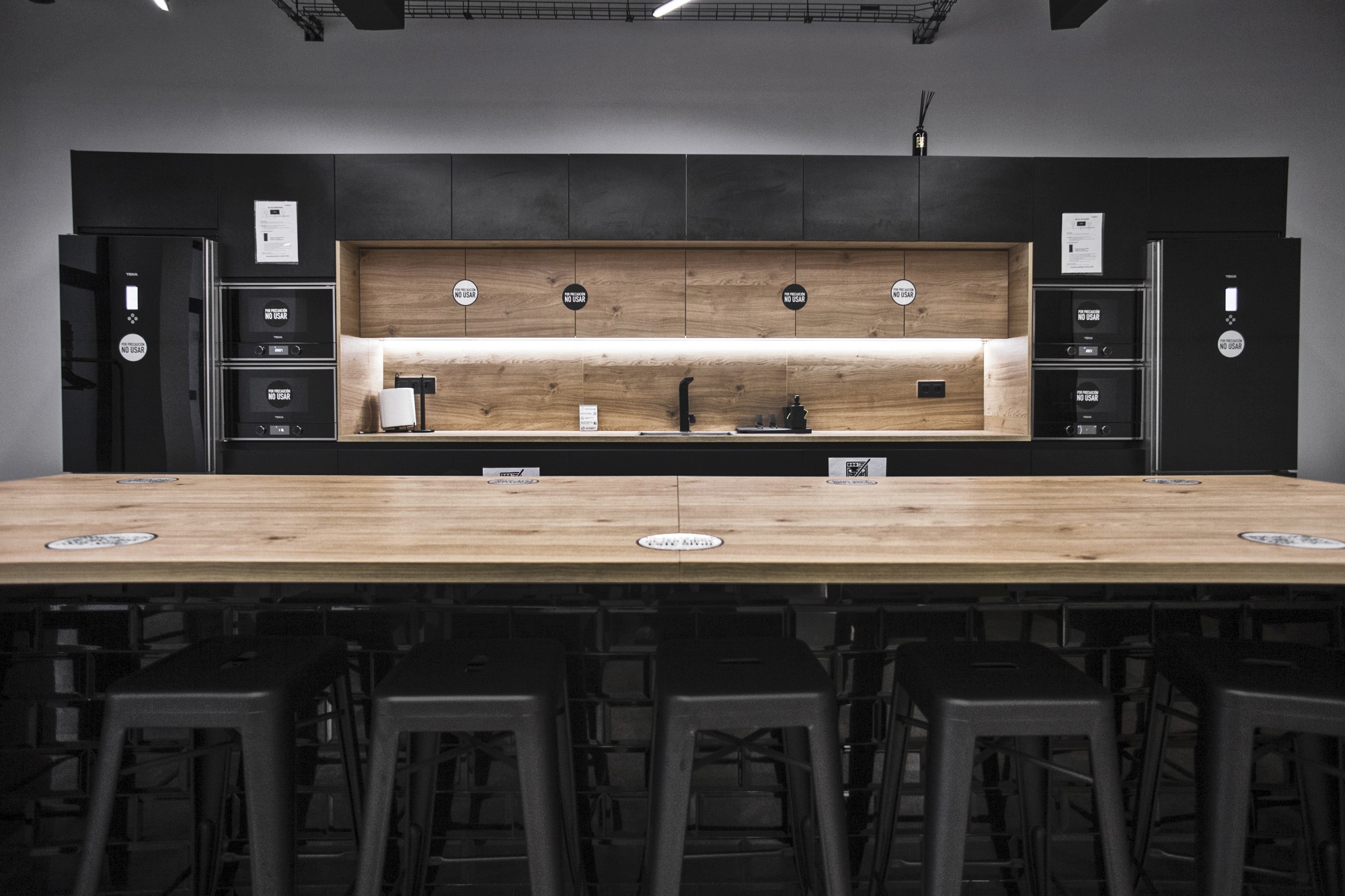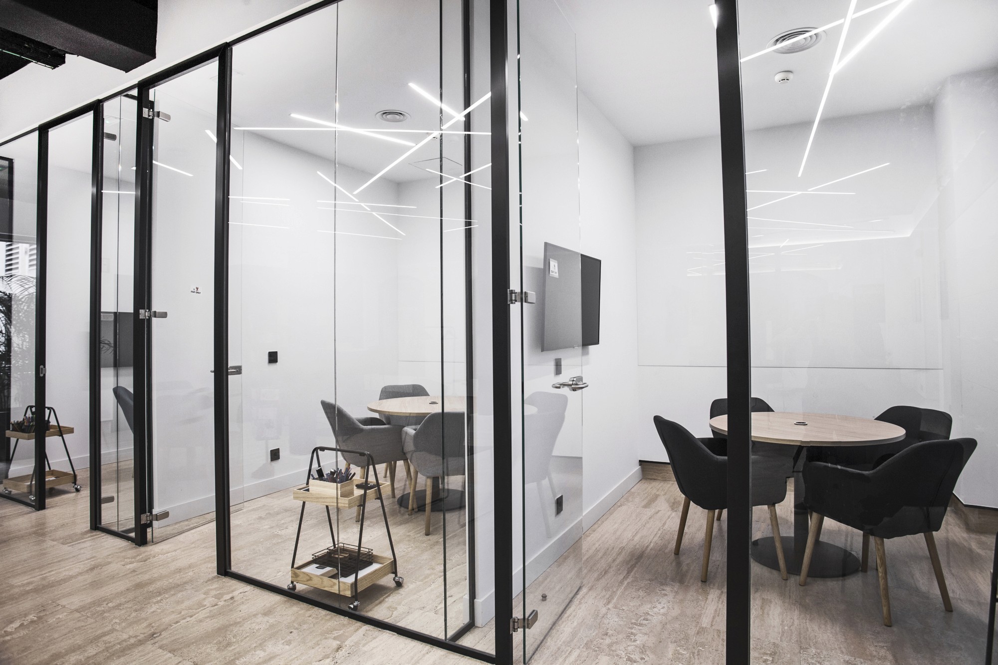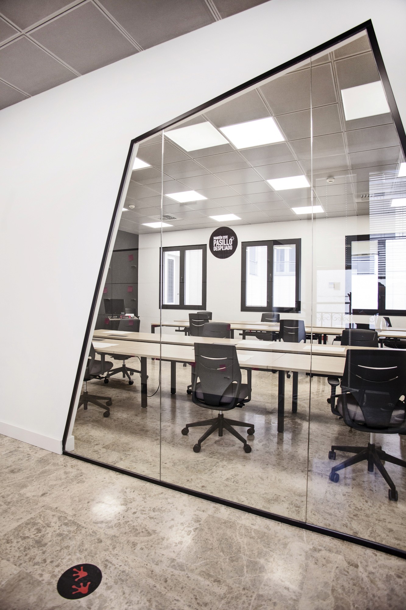 La intervención puso el foco en generar espacios polivalentes con separaciones de vidrio que aportan transparencia y continuidad, combinadas con una atmósfera más técnica en techo visto y una iluminación lineal que define el carácter del conjunto. Los acabados en tonos neutros, la carpintería cálida y la gráfica en pared refuerzan la identidad del proyecto y ordenan el recorrido, manteniendo el espacio luminoso y fácil de usar. El resultado es una oficina funcional y flexible, preparada para el uso intensivo diario y entregada en 16 semanas con coordinación total entre diseño, licencias y obra.
