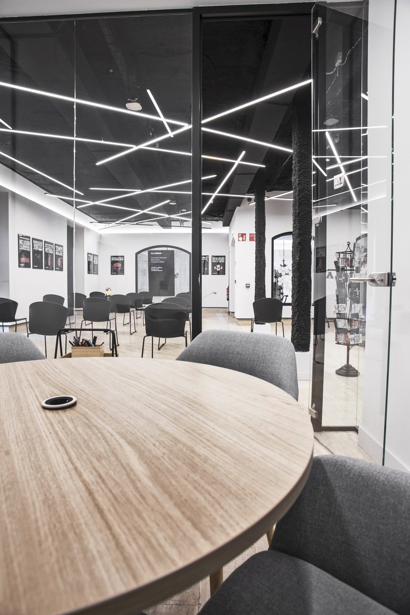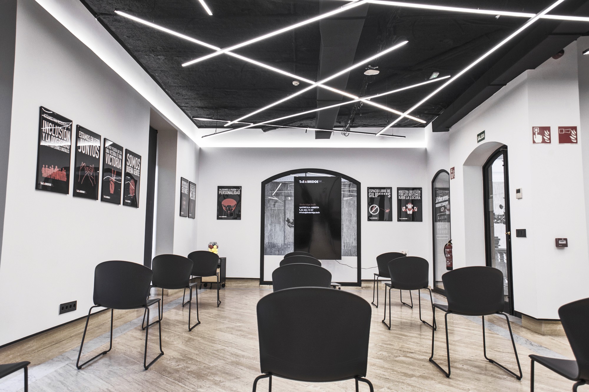 En las oficinas de The Bridge en Madrid desarrollamos un proyecto 360º que incluyó el diseño del espacio, el proyecto de actividad, la gestión completa de licencias, la coordinación de seguridad y salud, la apertura del centro de trabajo y la ejecución de la obra llave en mano. Con 1.425 m², el reto fue crear un entorno versátil para formación y trabajo, capaz de alternar zonas de encuentro, aulas y espacios colaborativos sin perder claridad, control acústico y una imagen contemporánea.